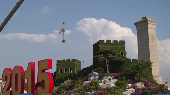 8月20日,为迎接中国人民抗日战争暨世界反法西斯战争胜利70周年纪念大会,天安门广场及其周边的一些区域被围栏挡住,紧张施工。